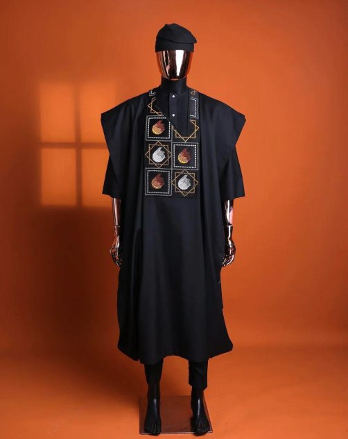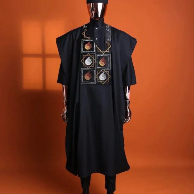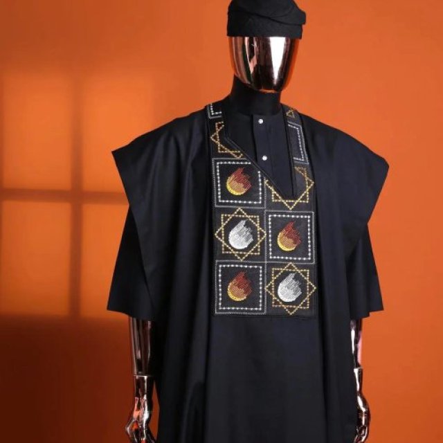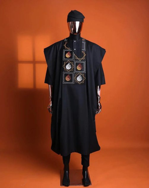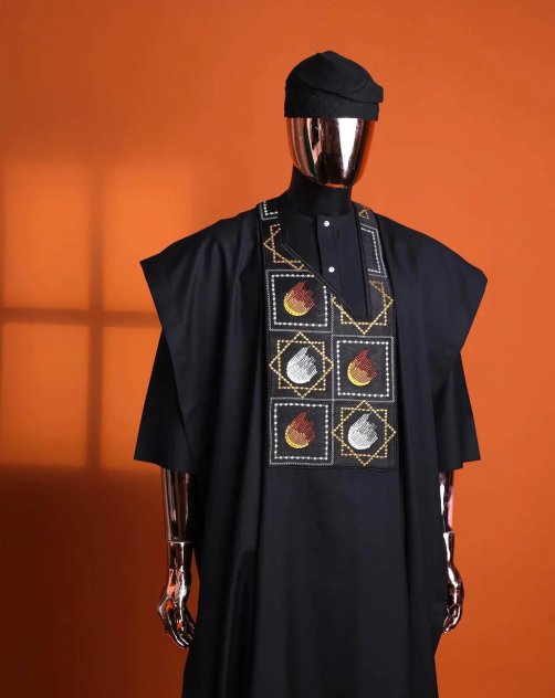 Rock up in this Black Agbada and trust me, nobody’s gonna forget you walked in. It’s got that vibe—bold, serious, straight-up regal—like you just walked out of a Nollywood movie premiere, or maybe you’ve got an entire kingdom to run after the party.